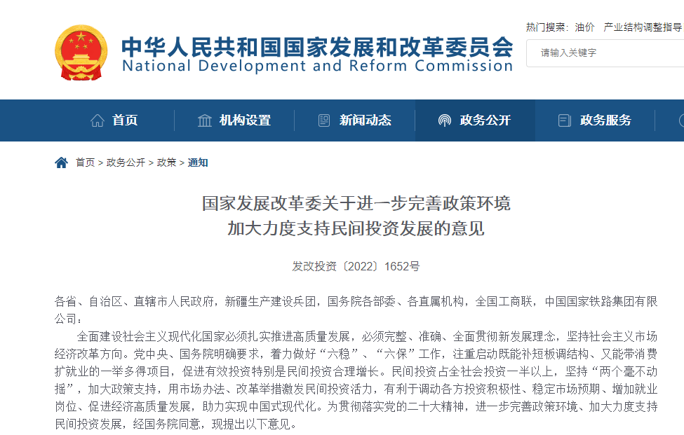 全面建設社會主義現代化國家必須扎實推進高質量發展,必須完整、準確、全面貫徹新發展理念,堅持社會主義市場經濟改革方向。黨中央、國務院明確要求,著力做好“六穩”、“六?!惫ぷ鳎⒅貑蛹饶苎a短板調結構、又能帶消費擴就業的一舉多得項目,促進有效投資特別是民間投資合理增長。民間投資占全社會投資一半以上,堅持“兩個毫不動搖”,加大政策支持,用市場辦法、改革舉措激發民間投資活力,有利于調動各方投資積極性、穩定市場預期、增加就業崗位、促進經濟高質量發展,助力實現中國式現代化。為貫徹落實黨的二十大精神,進一步完善政策環境、加大力度支持民間投資發展,經國務院同意,現提出以下意見。