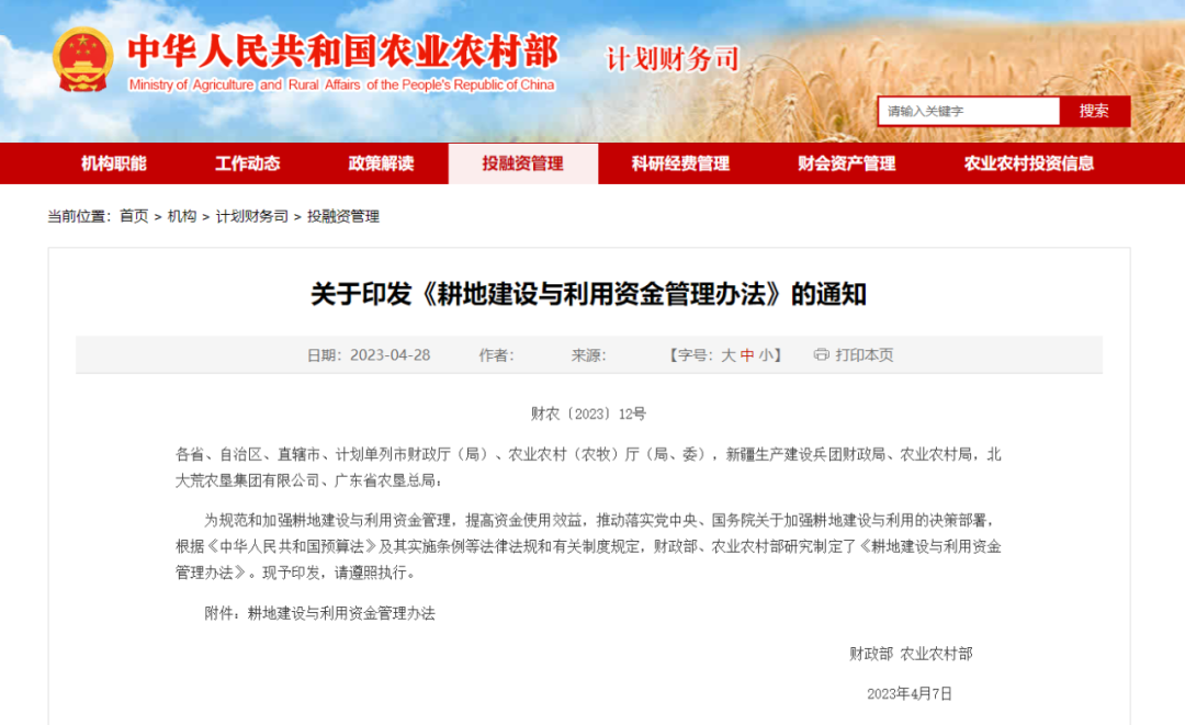 耕地建設(shè)與利用資金由財政部會同農(nóng)業(yè)農(nóng)村部管理。