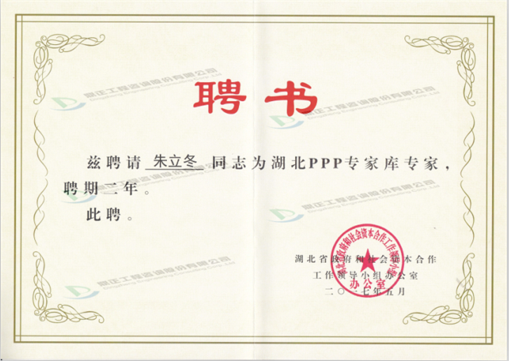 近日,湖北省政府和社會資本合作工作領導小組辦公室授予鼎正公司董事長王雁然先生、副總經理兼技術總監朱立冬教授為湖北省PPP專家庫專家。此前